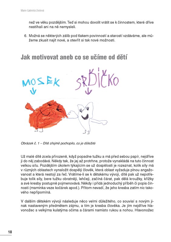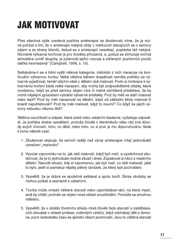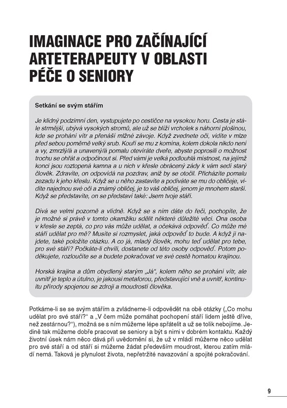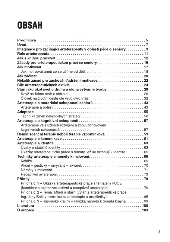 Témata pro zamyšlení a nové náměty pro arteterapeutické činnosti. Autorka u každé z uvedených metod a technik vysvětluje, ve kterých oblastech fungují a jaké obměny nabízejí, aby vedly k cíli, tj. k uchopení reality života, která je pro seniora žádoucí.