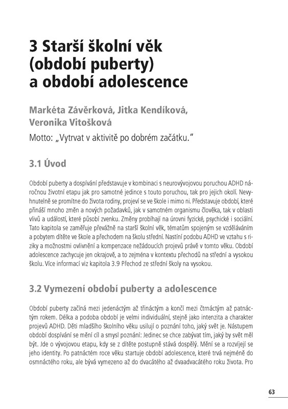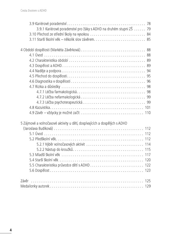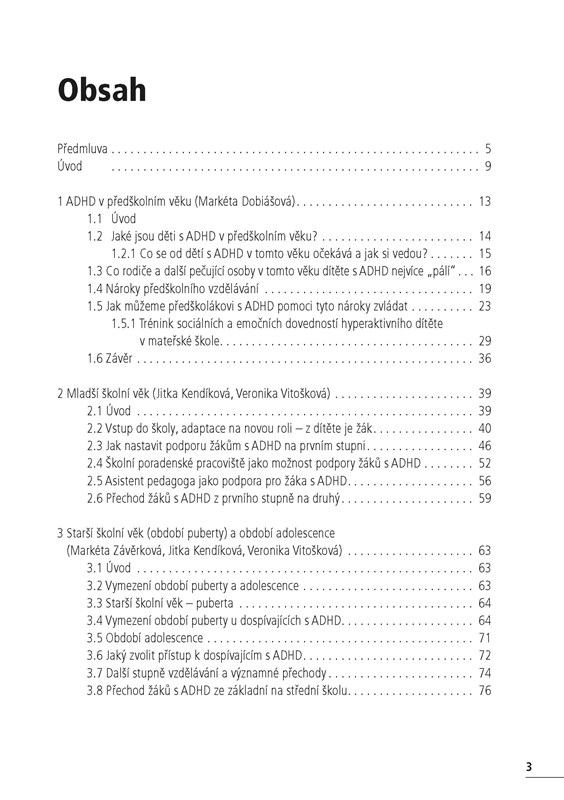Popis života dítěte s ADHD začíná v předškolním období, pokračuje mladším školním obdobím – pubertou – a adolescencí až po dospělost. Nechybí ani kapitola o mimoškolní oblasti, informace o možnostech a významu volnočasových aktivit. Autorky se v jednotlivých kapitolách zamýšlejí nad specifiky daného období, přinášejí svou profesní erudici i letité zkušenosti získané při práci s těmito jedinci v konkrétním prostředí, ve kterém se společně setkávají. Jednotlivé kapitoly nastiňují potřeby těchto osob i nároky, které jsou na ně v jednotlivých životních fázích kladeny. Přibližují a popisují rizika, do kterých vstupují. Zaměřují se na klíčové momenty vývoje jedince. Nedílnou součástí každé kapitoly je nabídka možností a inspirací, jak s těmito jedinci komunikovat, spolupracovat. Jak u nich podporovat to, co funguje. Jak čelit problémům a jejich důsledkům vyplývajícím z ADHD. Jak pomáhat žákům přímo ve škole. Každou kapitolu doplňují příklady z praxe nebo kazuistiky.