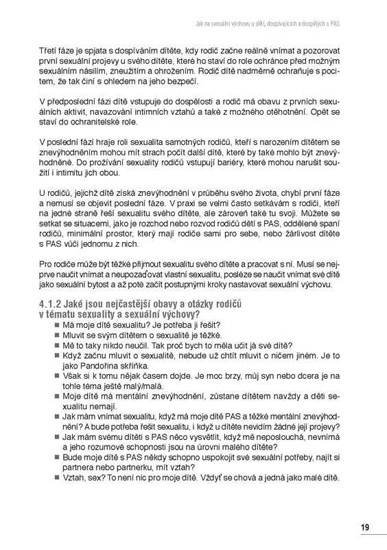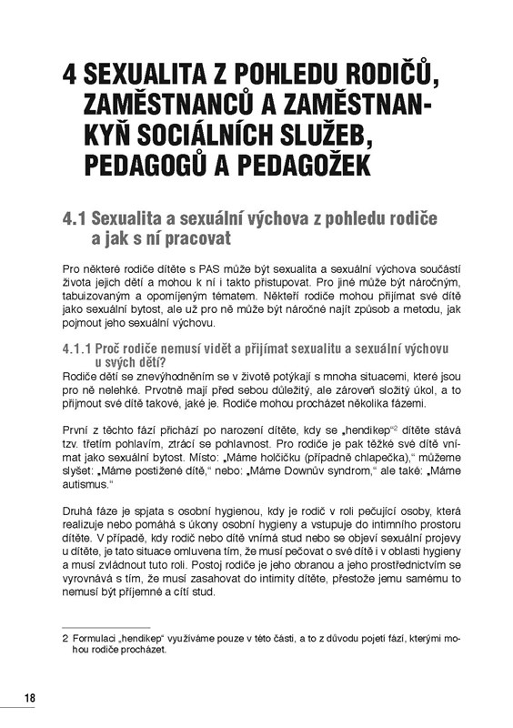 Věnuje se např. otázce, kdy je vhodné se sexuální výchovou začít, rozebírá jakým tématům je potřeba se s dětmi a dospívajícími s PAS věnovat (doteky, soukromí, sebeuvědomění, osobní hygiena). Zpracovává také téma hranic a pravidel v sexuální výchově a osvětě a téma mezilidských vztahů. Samostatná kapitola je věnována pubertě u dětí s PAS a sexualitě lidí s těžkým mentálním znevýhodněním. Kniha je protkána množstvím příkladů z praxe. Shrnuje vhodné metody práce s tématem sexuality, jako jsou např. vizualizace, myšlenkové mapy či modelové situace. V příloze knihy najdou rodiče, pedagogové a pedagožky i pracovníci a pracovnice v sociálních službách mj. souhrn dostupných materiálů, pomůcek a literatury, ale např. i filmů a videí k tématu sexuální výchovy.
