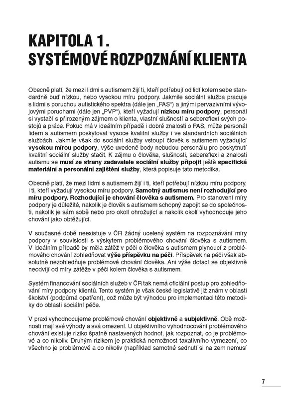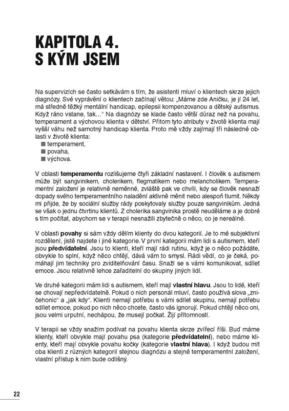 V České republice prozatím chybí ucelený model sociálních služeb pro lidi s takovýmto typem handicapu, kteří potřebují vyšší míru podpory. Publikace toto téma otevírá, nemá však ambici představit ucelený model práce s lidmi s chováním náročným na péči. Zabývá se hlavně otázkou systémového rozpoznání klienta s vyšší mírou podpory a metodikou práce s lidmi s těžším problémovým chováním pro pečující personál. Autor vychází z osobních zkušeností s klienty a ze supervizí v různých zařízeních. Na konkrétních příkladech ukazuje, jak lze o klientech uvažovat a co s nimi dělat.