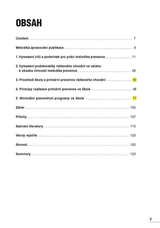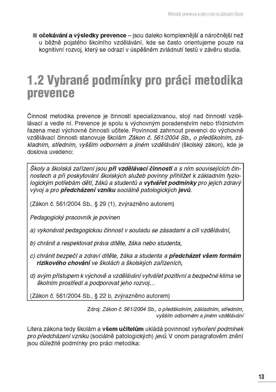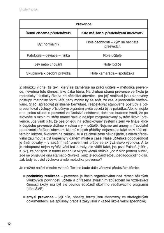 Jaká je při tom role školního metodika prevence? Jaké možnosti v praxi vůbec má? To jsou jen některé z otázek, na které tato publikace odpovídá. Autor knihy – vysokoškolský pedagog s dlouholetou zkušeností učitele na střední škole – se na pozici metodika prevence dívá ze všech úhlů pohledu. Mimo jiné definuje jeho povinnosti a celkově se zabývá postavením metodika prevence ve škole. Na příkladech z praxe ukazuje, jak by měla vypadat spolupráce s ostatními kolegy i pracovníky školního poradenského pracoviště.