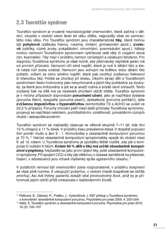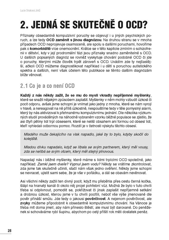 Publikace se snaží rozšířit povědomí o závažnosti obsedantně kompulzivní poruchy (OCD) a přestavuje možnosti terapie a její specifika, jedná–li se o dětského či dospívajícího klienta. Psychické potíže dítěte nebo dospívajícího mohou být důsledkem nestability a problémů v rodině. Neřešené problémy se někdy stávají spouštěčem OCD. Tato duševní porucha je nejen pro nemocného, ale i pro jeho rodinu velmi zatěžující. Ve své rozvinuté formě má OCD za následek nejen omezení volného času, zpřetrhání společenských vazeb, ale i snížení školního výkonu či ztrátu zaměstnání. Může se objevit depresivní ladění a téměř vždy snížené sebevědomí.