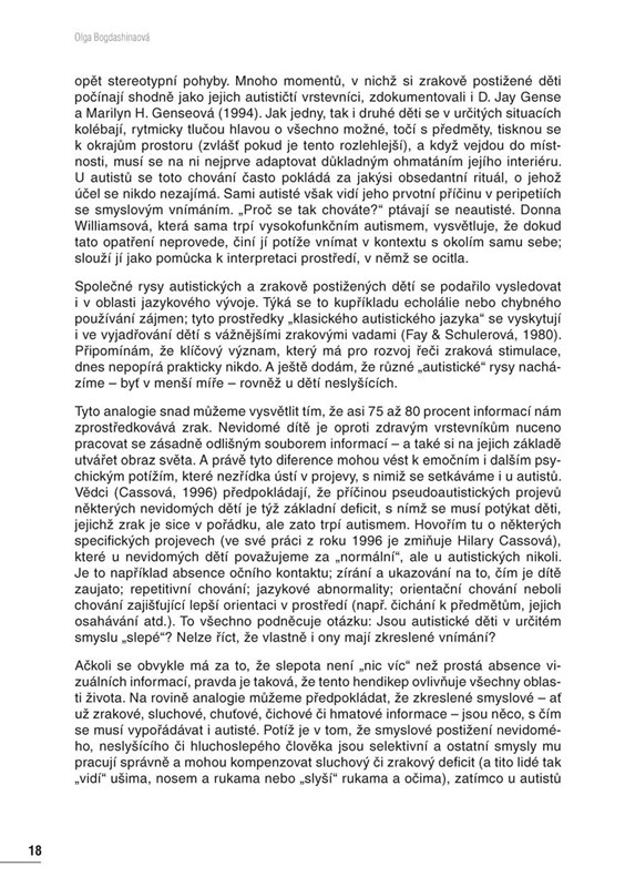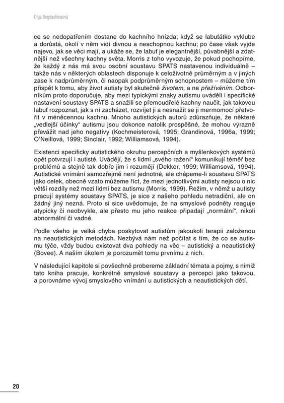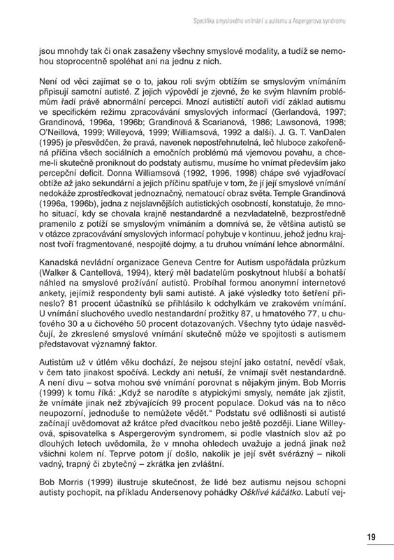 Publikace se velmi podrobně věnuje specifikům smyslového vnímání u lidí s autismem a s Aspergerovým syndromem. Je určena pro odbornou veřejnost, cenné informace zde však najdou i rodiče dětí s autismem a všichni, kdo se o téma autismu zajímají. Kniha jim pomůže pochopit jednu z podstatných stránek autismu a ukazuje cestu, jak odlišnosti ve smyslovém vnímání diagnostikovat a kompenzovat.