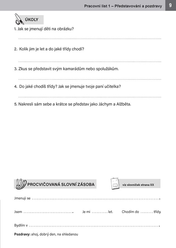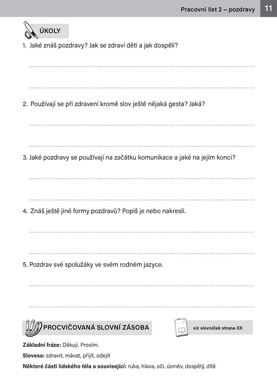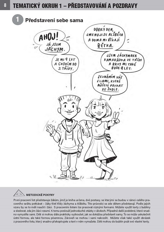 Soubor 30 pracovních listů je určen pro práci se žáky s odlišným mateřským jazykem. Žáci se při práci s listy naučí lépe orientovat ve školním prostředí a pochopí organizaci i způsob výuky v české škole. Zároveň si také osvojí základní slovní zásobu potřebnou k fungování v českém jazykovém prostředí (jako např. pozdravy, představování, pojmenování členů rodiny, svátků, oblečení, ročních období, předmětů ve škole, zájmových aktivit, zaměstnanců školy atd.) Díky práci s příručkou se kromě komunikačních schopností rozvíjí i další dovednosti, zejména osobnostní a sociální. Děti si potrénují paměť, ale i pozornost a soustředění. Proto je lze využívat i při práci s jinými žáky, např. těmi s různými speciálními vzdělávacími potřebami.
