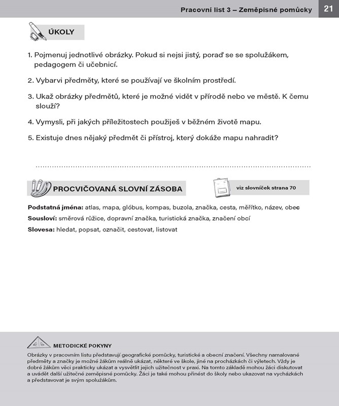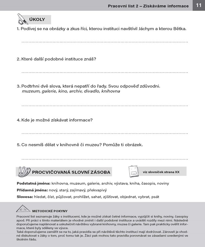 S pracovními listy mohou žáci s OMJ pracovat se svými učiteli, asistenty, družináři, případně s rodiči či staršími sourozenci. Proto jsou listy doplněny stručnými metodickými pokyny a procvičovanou slovní zásobou. V závěru publikace je umístěn abecedně řazený slovník použité slovní zásoby. Na prázdnou linku za každým slovem si mohou žáci zapisovat význam slova v mateřském jazyce.
