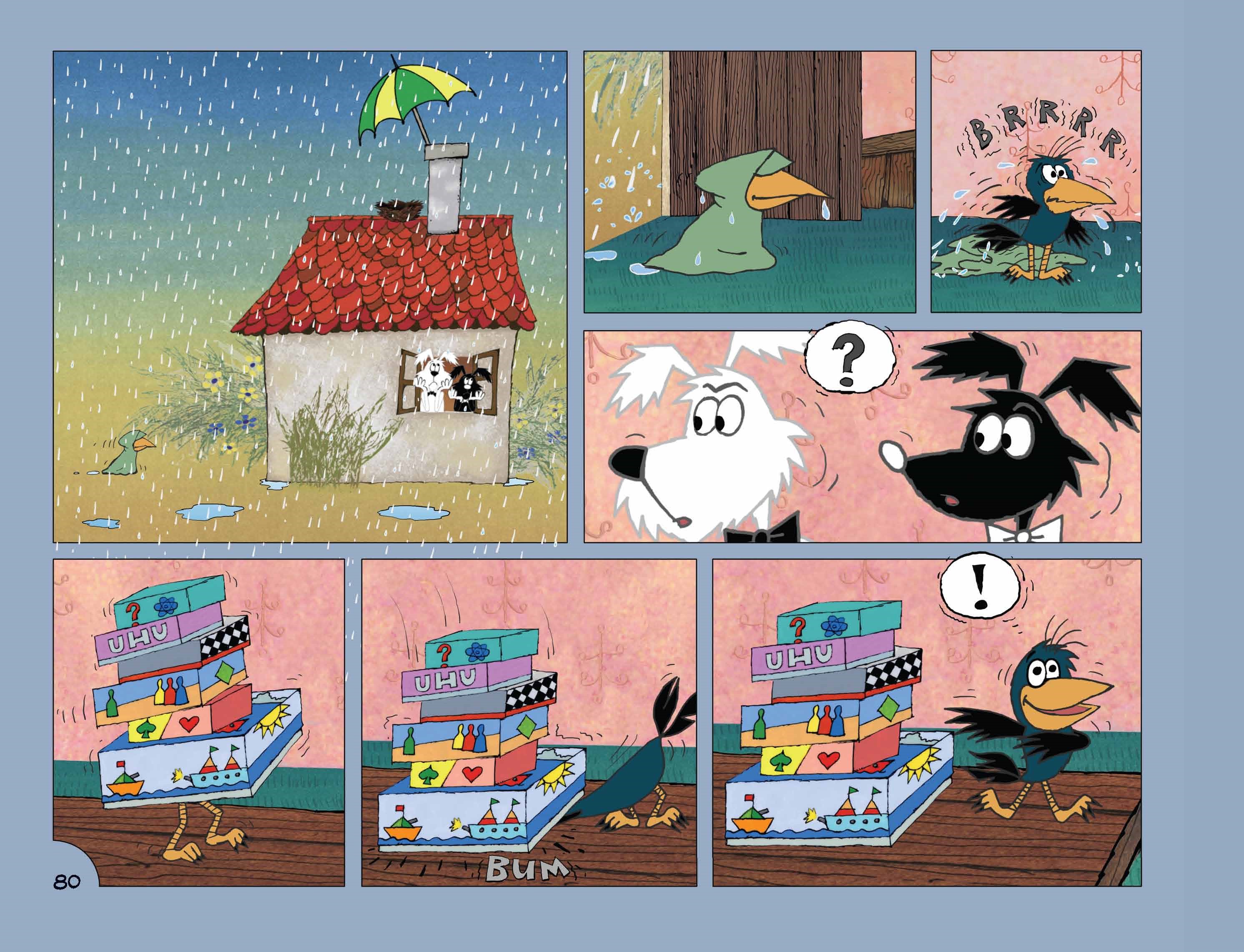 Podle večerníčku Martina Otevřela a Jiřího Munka, s obrázky Zdeňka Smetany za autorské spolupráce Marii Axamitové, nakreslil a napsal Martin Otevřel. Štaflík a Špagetka bydlí v chaloupce a je jim spolu dobře. Ráno se jim ale nikdy nechce vstávat. Jenže na střeše za komínem bydlí ještě poťouchlá vrána, známé ranní ptáče, takže je nikdy dlouho spát nenechá. Každý den vymýšlí, jakou lumpárnu by jim vyvedla.
