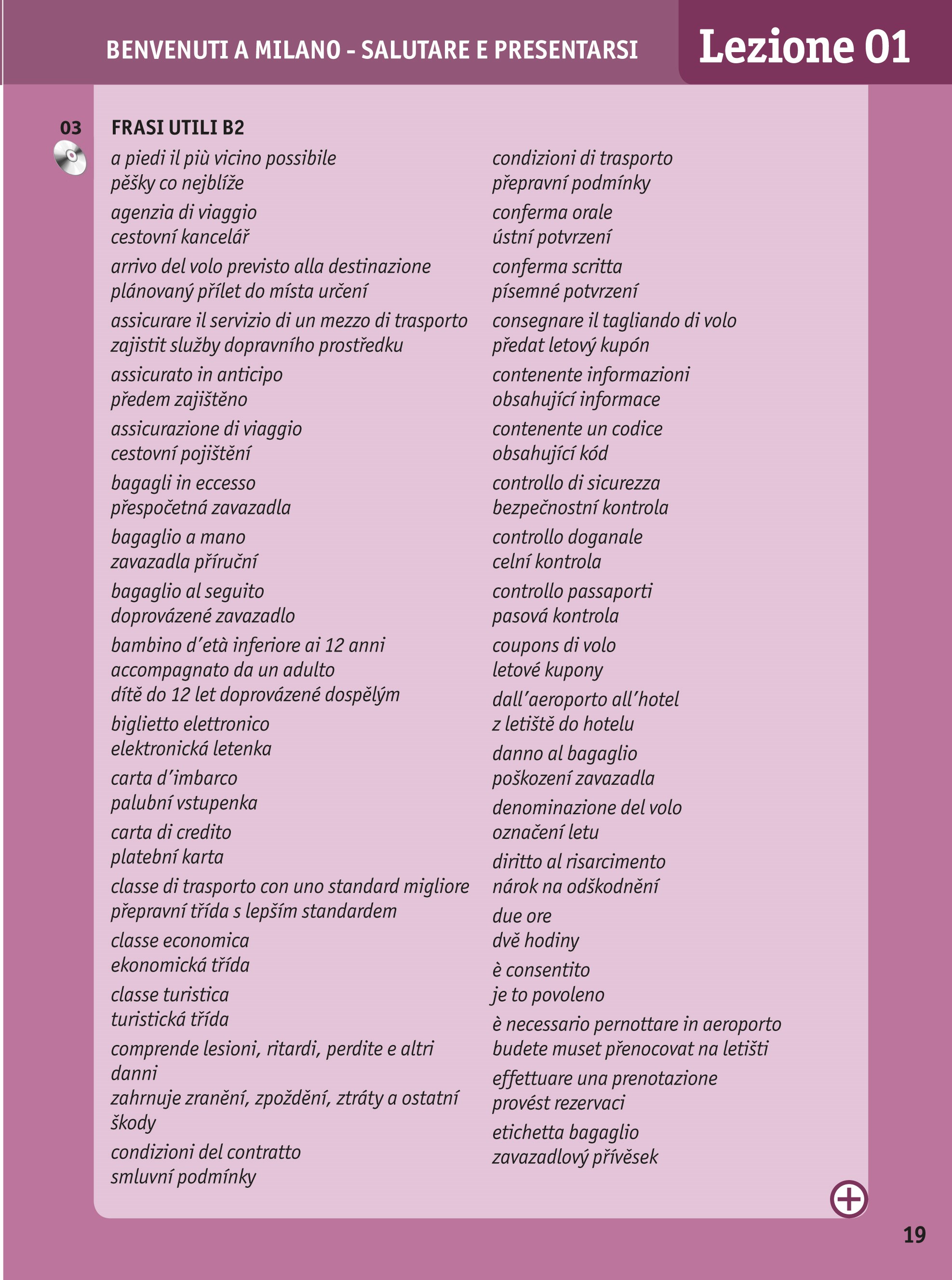 Konverzační příručka je určena středně pokročilým studentům úrovně B2, ale inspiraci, užitečné fráze, slovní zásobu i gramatiku v ní mohou nalézt i studenti pokročilí nebo a úplní začátečníci. Je vybavena poměrně detailní průpravou k výslovnosti, srovnávacími memorizačními metodami a audio materiálem. Pokročilejším budou prospěšné vysvětlivky některých výrazů pod dialogy (ve stylu výuky výkladových monolinguálních slovníků) a možná ocení i přiloženou první kapitolu z Manzoniho Snoubenců pro nácvik čtení.
