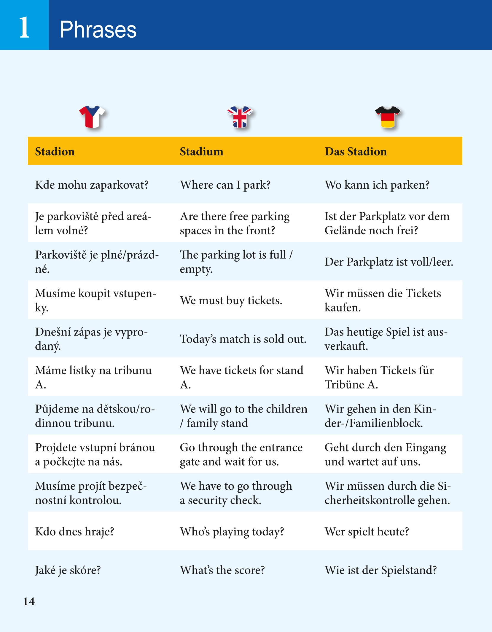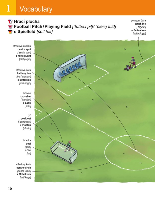 Osvojit si je mohou v šikovné příručce se spoustou ilustrací, které znázorňují běžné fotbalové situace. Obrázky jsou popsány, a to ihned ve dvou jazycích – angličtině a němčině. Každý tematický okruh je doplněn typickými frázemi a cvičeními na upevnění slovní zásoby. Cvičení jsou rozdělena do třech úrovní pokročilosti.