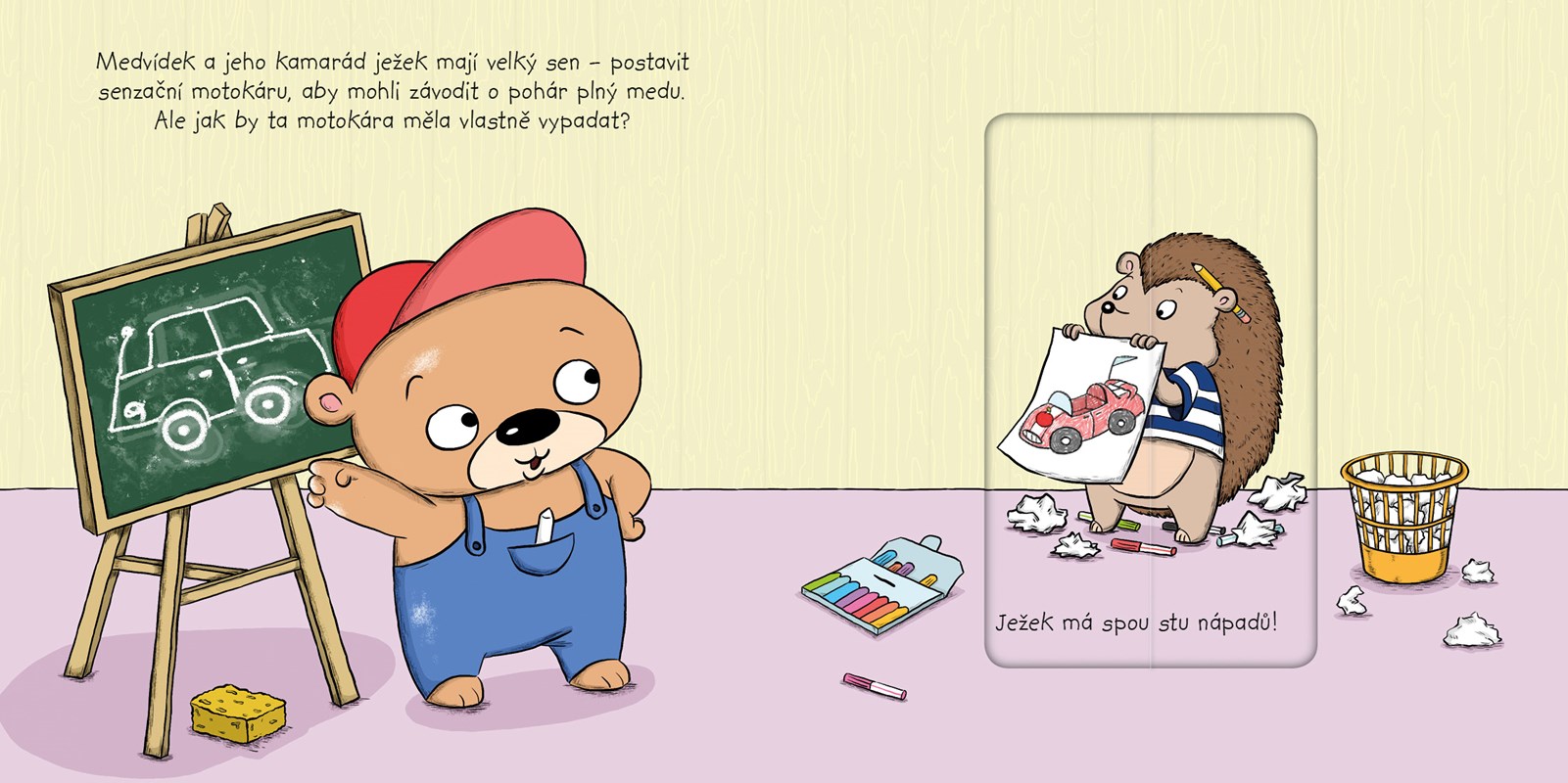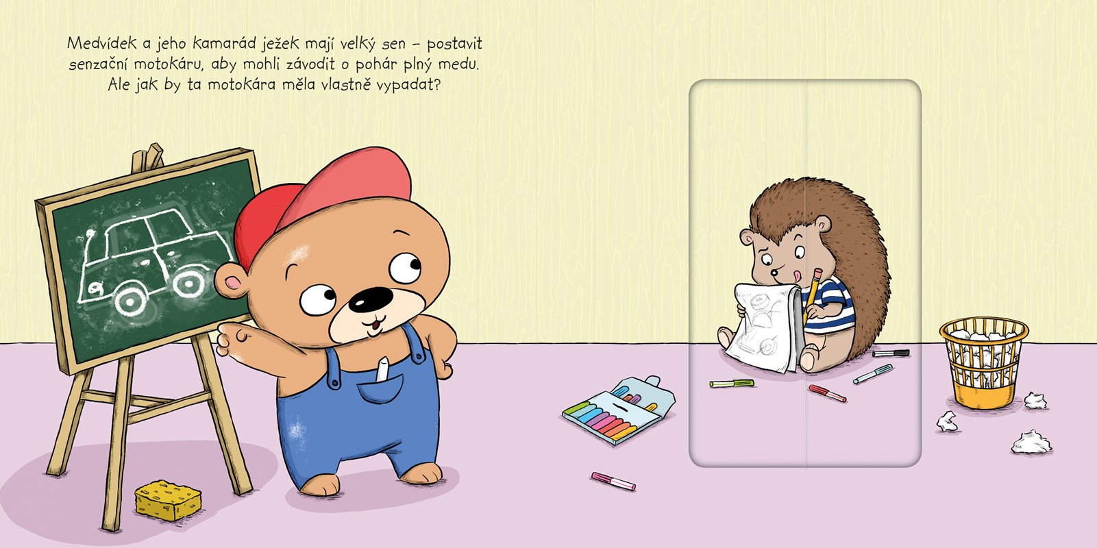 Jak postavit motokáru? To máte: dřevo, metr, pilu, vrtačku, kola, šroubky, volant, šroubovák… Medvídka zkrátka čeká spousta práce. Pomůže mu vůbec někdo? Ale to víš, že jo. Ježek stejně jako medvídek má totiž velký sen – zúčastnit se závodu o pohár plný medu. Tak jim drž palce, ať se jim ta motokára podaří. A nezapomeň na kouzelné táhlo! Díky němu se ti změní obrázky přímo před očima.