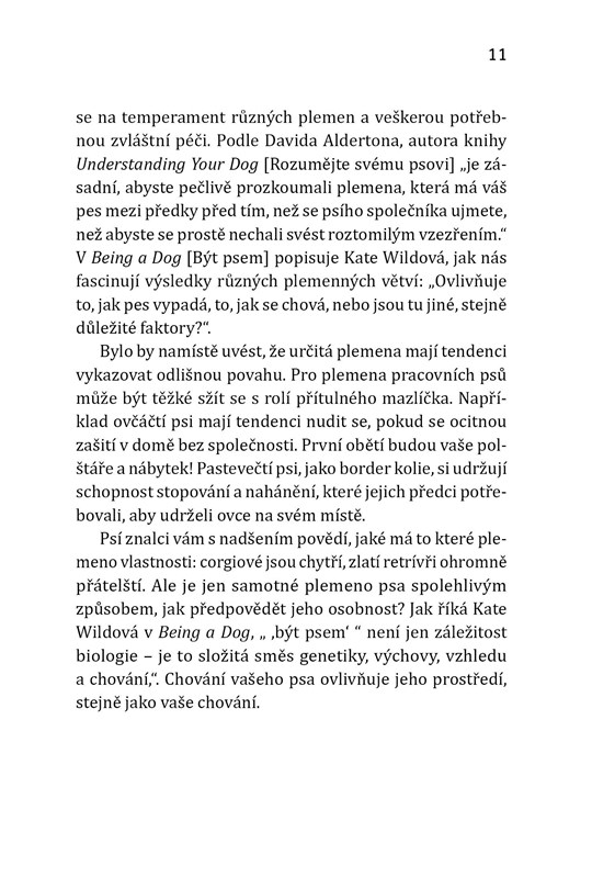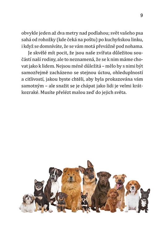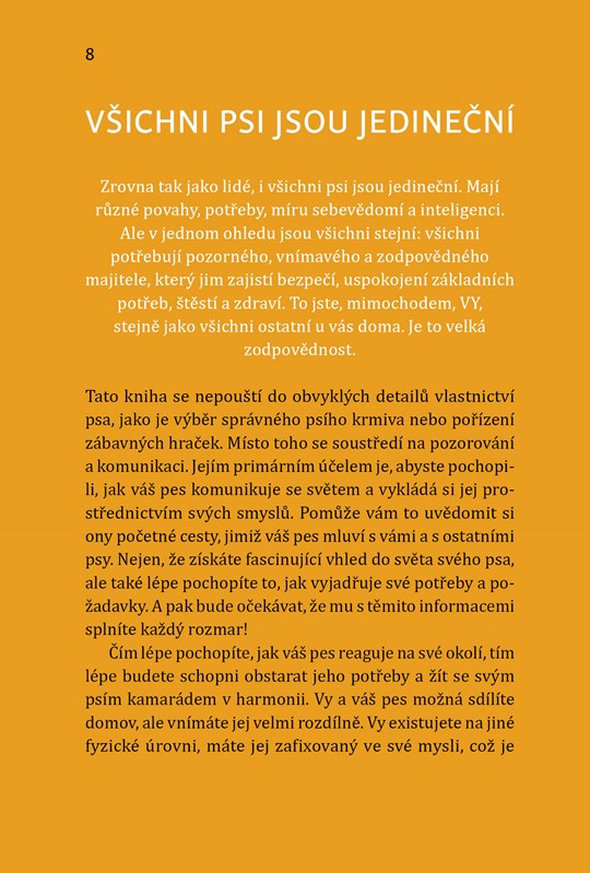 Psi jsou báječná stvoření. Chtějí vás potěšit uslintanými pusinkami a, máte-li štěstí, přinesou vám svou oblíbenou a ze všech nejumolousanější kousací hračku. Vše, co za to chtějí, je láska a pozornost … a jídlo. Tato kniha se nepouští do obvyklých detailů vlastnictví psa, jako je výběr správného psího krmiva nebo pořízení zábavných hraček. Místo toho se soustředí na pozorování a komunikaci. Jejím primárním účelem je, abyste pochopili, jak váš pes komunikuje se světem a vykládá si jej prostřednictvím svých smyslů. Pomůže vám to uvědomit si ony početné cesty, jimiž váš pes mluví s vámi a s ostatními psy. Nejen, že získáte fascinující vhled do světa svého psa, ale také lépe pochopíte to, jak vyjadřuje své potřeby a požadavky. A pak bude očekávat, že mu s těmito informacemi splníte každý rozmar!