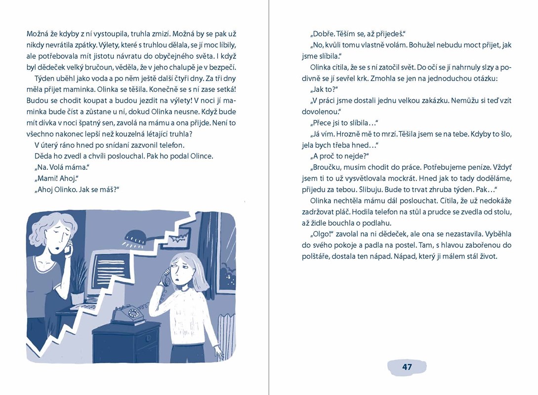 Šestiletá Olinka jede na prázdniny k dědečkovi do Vehlovic. Že by se ale těšila? O tom vůbec nemůže být řeč. Děda je pěkný mrzout a nejradši by jen chodil na ryby, díval se na televizi a jedl párky. Jednoho dne Olinka na půdě objeví tajemnou truhlu s mosazným kováním a v uzívaných Vehlovicích se konečně začnou dít pořádná prázdninová dobrodružství. Díky truhle se dívka dostane do napínavých příběhů těch nejkrásnějších knížek. Ale pozor! V knížkách čeká nejen dobrodružství, ale i pořádná dávka nebezpečí…