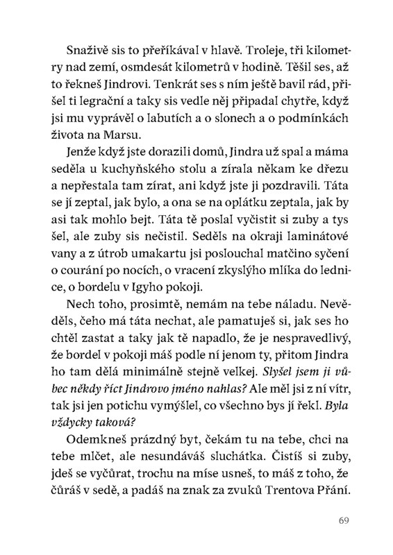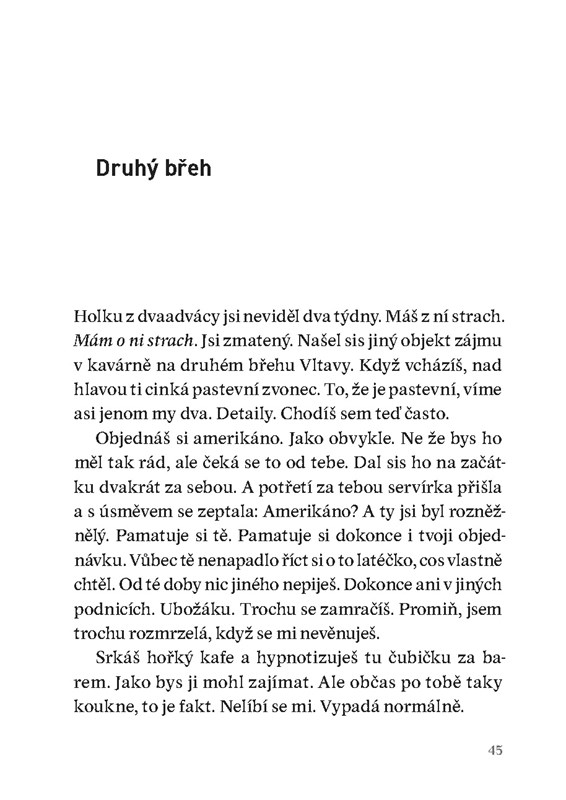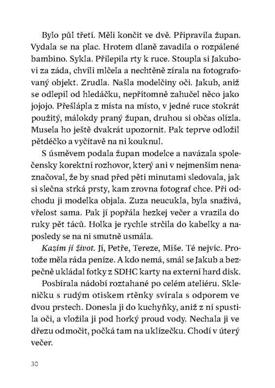 Koncentrovaná psychologická novela zaznamenává hraniční události a křehký svět lidských vztahů. Úsporný příběh citlivě, s hlubokým pochopením i s ironickým odstupem tajemné vypravěčky modeluje životní mezníky, které se ztrácejí v syrové každodennosti, již okupuje samota, ale i naděje na lásku a něhu.