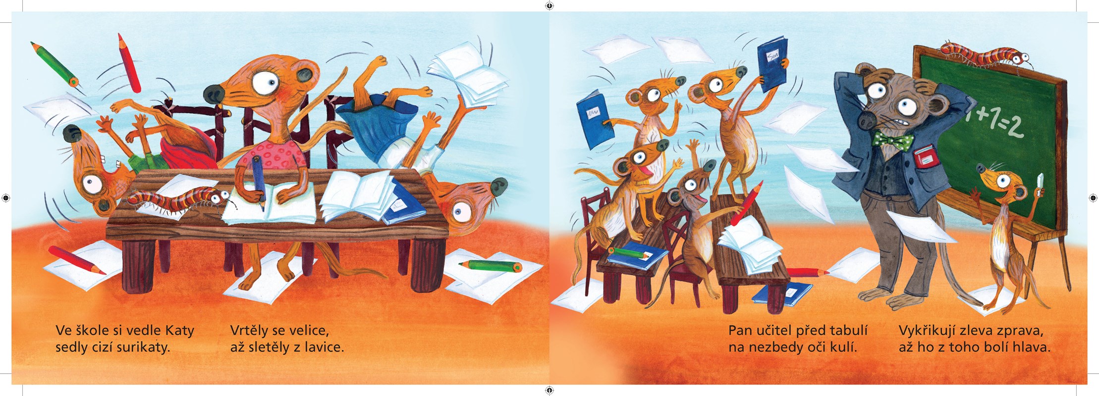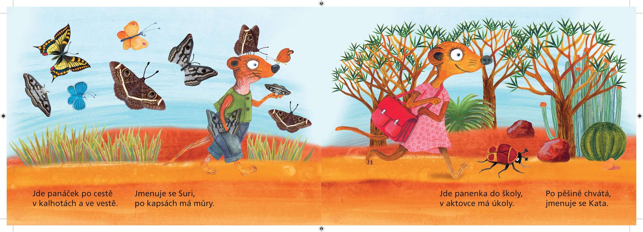 Veselé leporelo o šelmičkách surikatách. Děti se nejen pobaví vtipnými verši, ale dozvědí se i spoustu zajímavých věcí, například že když se surikaty vyhřívají na sluníčku, někdo z rodiny musí pořád dávat pozor. Pokud spatří nebezpečí, křikne a všichni se hned schovají do děr v zemi. Žijí na poušti nebo suché savaně jižní Afriky, ale podívat se na tahle roztomilá zvířátka lze i v zoo.