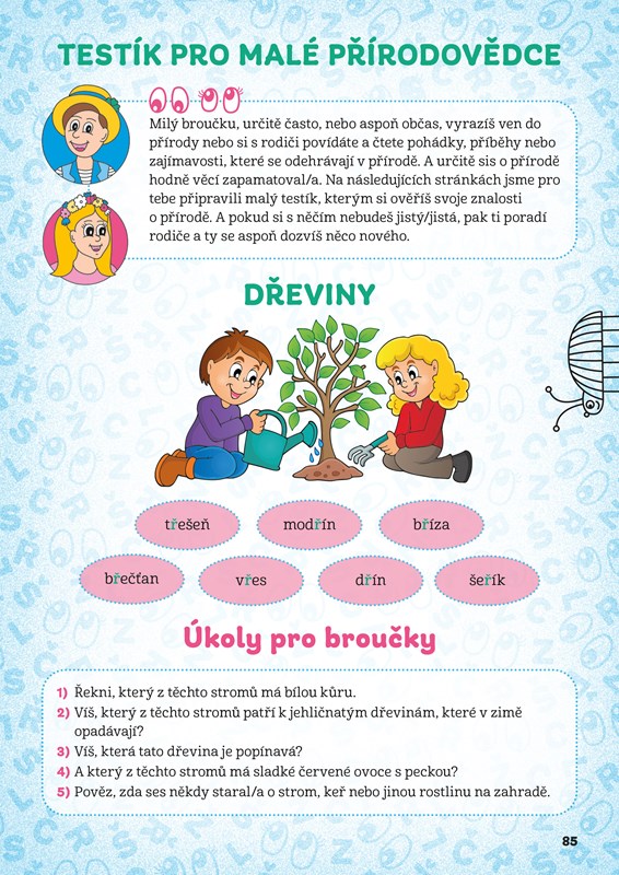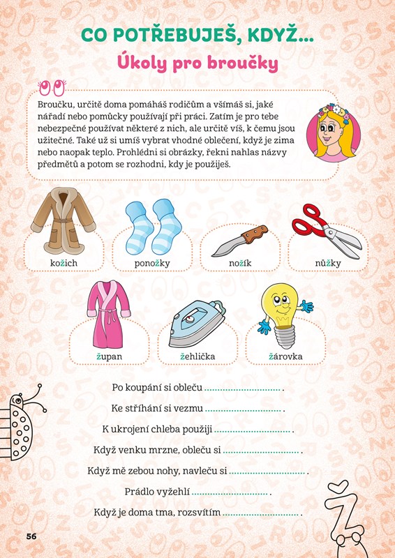 * Úkoly pro broučky – uvádějí Štístko a Poupěnka prostřednictvím jednoduchých grafických ikon. Procházením pestrých a zábavných úkolů budete zvolna zavádět hlásku do běžné řeči. Procvičíte nejen výslovnost hlásek, ale také rozšíříte slovní zásobu, vyzkoušíte další dovednosti a získáte nové znalosti. Začtete se do obrázkového čtení, zjistíte, o čem si povídá papírový drak s pohádkovým, co řeší žabí velmož, ověříte si znalosti o přírodě, lidském těle, nahlédnete pod pokličku pana šéfkuchaře a hlavně se vypravíte se Štístkem a Poupěnkou na výlet.