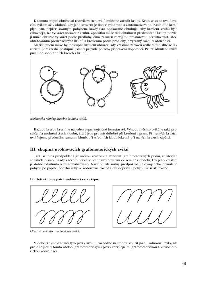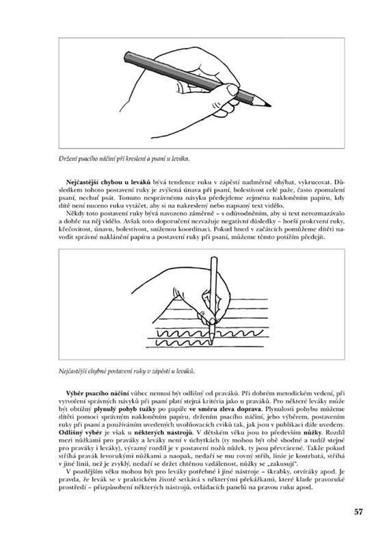 Vyzbrojeni základními odbornými informacemi budeme dále dobře pracovat na rozvíjení hrubé a jemné motoriky, které jsou předpokladem grafomotorických dovedností dítěte. Autorky nám nabízejí spoustu činností a cvičení, ukázek pomůcek, které si můžeme ve škole i doma vyrobit. Významná jsou doporučení týkající se pracovních návyků, sezení při kreslení a psaní, výběru kreslicích a psacích potřeb. Mnoho nepříjemností při psaní je zapříčiněno špatným úchopem psacího náčiní, je tedy nutno mu předcházet už v počátcích kreslení. Často mívají děti při psaní potíže s tím, že příliš „tlačí“ na tužku; proto se dovíme, jak ruku uvolnit, jaká grafomotorická cvičení pomohou dítěti kreslit a psát lehce, s jistotou, s chutí. Dostaneme odpovědi na otázky, které zajímají mnoho pedagogů i rodičů, např. jak má psát levák a má-li se dítě učit psát v předškolním věku. A nakonec nalezneme možnosti pomoci při obtížích, praktická, srozumitelná, odborně podložená doporučení včetně další literatury pro zájemce.