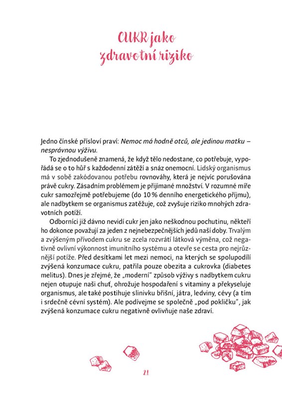 Oblíbená autorka Jarmila Mandžuková přichází s novou knížkou, ve které se věnuje "sladkému životu bez cukru". V úvodních kapitolách přináší rady, jak omezit spotřebu cukru, jak zdravě mlsat a čím zdravěji sladit. Snadno vás přesvědčí, že i život bez cukru může být sladký. Alternativních a zdravějších druhů cukru je v nabídce obchodů se zdravou výživou celá řada. Náhradou cukru mohou být i a přírodní sladidla, zejména čerstvé a sušené ovoce. Druhá část knihy přináší autorkou vyzkoušené, jednoduché a lákavé recepty, které nám pomohou proplout všemi úskalími života bez cukru a naučí nás zahnat chuť na sladké.