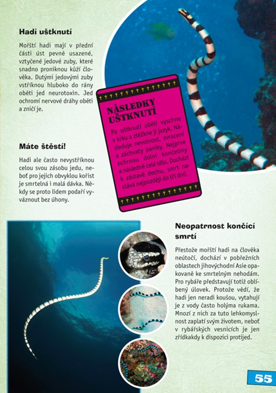 Na základě zevrubných charakteristik a četných fotografií vás kniha seznámí s těmito a dalšími pozoruhodnými živočichy a představí vám také jejich smrticí zbraně. Přehledná stupnice zřetelně ukazuje, jak nebezpeční jednotliví živočichové jsou.
