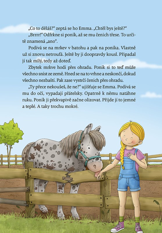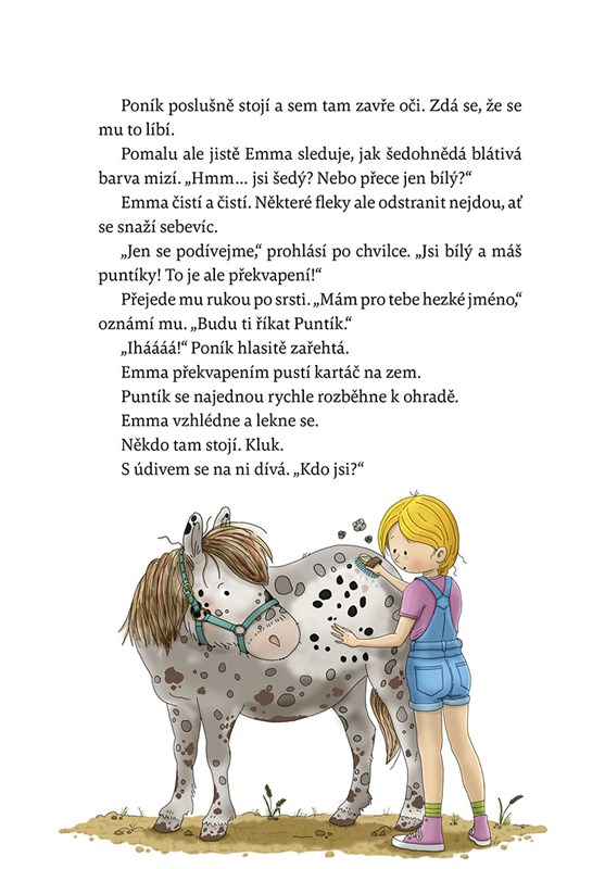 Nedaleko svého nového domu narazí Emma na poníka. Stojí úplně sám na pastvině u polorozpadlého statku. Je celý ušpiněný od bahna. Emma toho o koních moc neví, ale teď vidí, že poník potřebuje kamaráda. Dá mu jméno Puntík.