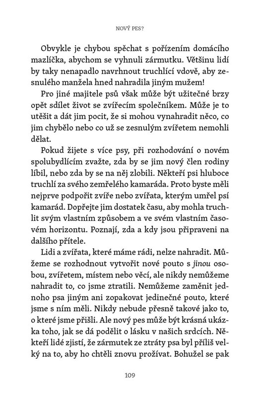 Jak se vyrovnat s odcházením a smrtí našich psů? Kdy a podle čeho se rozhodnout nechat psa zemřít? Elli Radingerová chce dodat sílu těm, jejichž pejsek pomalu stárne a konec je na dohled. Bestsellerová autorka připravuje čtenáře a majitele psích mazlíčků na to, jak pečovat o psa, který brzy zemře, nebo je provází procesem truchlení. Rozloučení s mazlíčkem nemusí nutně znamenat konec, může to být i začátek, ale v každém případě to může být dar. Elli Radingerová ukazuje, jakou sílu a sebedůvěru skrývá odvážné přijetí tohoto posledního daru od našeho psa a co se můžeme od našich zvířat v posledních chvílích života naučit. Dojemná kniha pro všechny, kteří chtějí pomoci sobě i svým zvířatům při loučení, a srdceryvný společník při smutku a bolesti po smrti zvířete - až k nové nadějné odvaze žít dál.