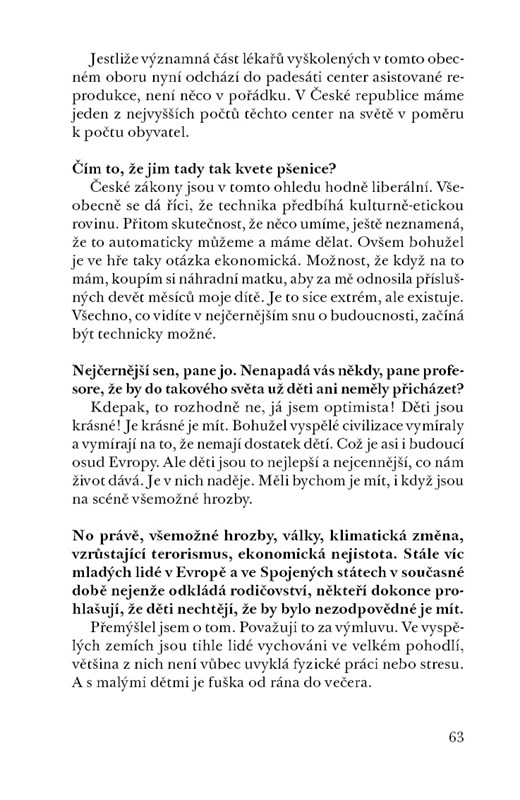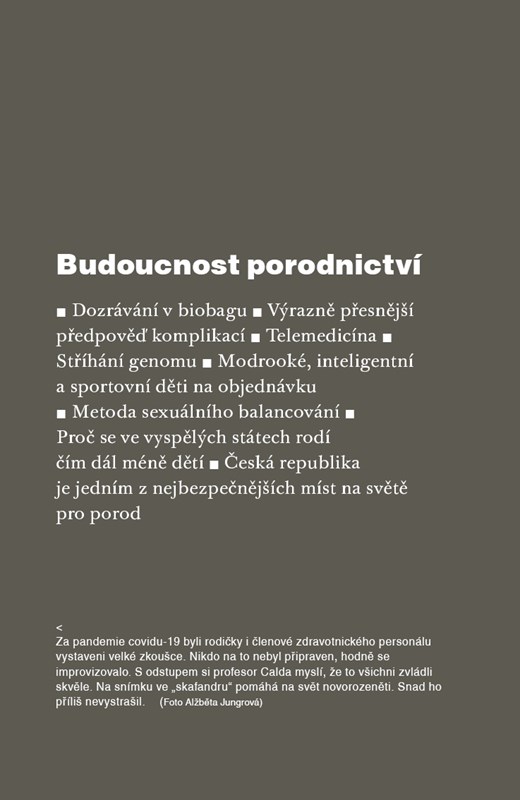 Knižní rozhovor s Pavlem Caldou, který vedla známá publicistka Libuše Koubská, se věnuje též aktuálním otázkám – například prevenci těhotenských komplikací, možnostem léčby plodu v děloze, nebezpečnému posouvání mateřství do vyššího věku, příčinám poklesu zájmu partnerů mít děti, problematice asistované reprodukce a náhradního mateřství či perspektivě umělé dělohy, která umožní, aby embryo a potom plod vyrostl úplně mimo tělo matky.