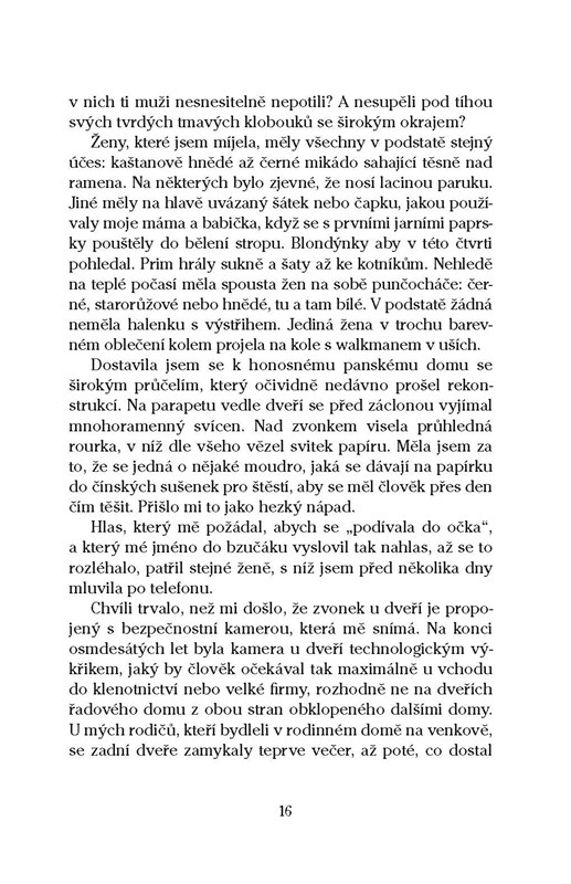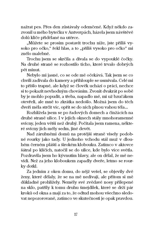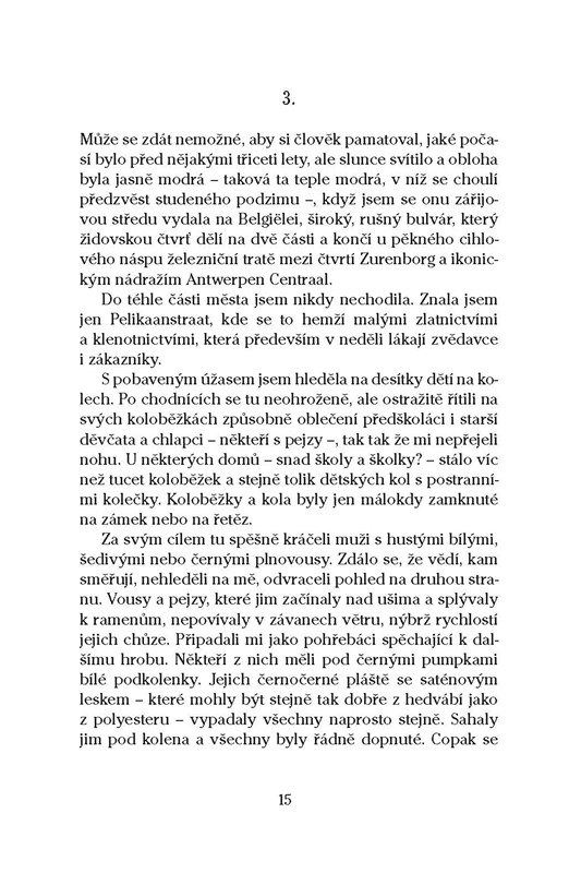V židovské čtvrti belgických Antverp žije největší komunita ortodoxních Židů po New Yorku a Jeruzalémě. Jejich štrajmly, pejzy, černé kabáty a bílé podkolenky upomínají, že sem kdysi přišli z východní Evropy. Proniknout do jejich zákulisí, tajů a tradic je pro lidi zvenčí těžké, ne-li nemožné. Novinářce a spisovatelce Margot Vanderstraeten se to podařilo. Za léta, kdy v moderně ortodoxní židovské rodině jako studentka doučovala děti, si vybudovala pevné přátelství s rodinou Schneiderů, a nakoukla do světa, jehož čas, směr i rytmus i v moderní době udává 613 židovských přikázaní. Díky jejímu čtivému vyprávění se tak dozvíme, proč židovské ženy v Antverpách nosí na hlavách paruky, že každá věřící židovská rodina má dvě separátní kuchyně a jak jsou důležité dohazovačky sňatků. Podíváme se jejíma očima i do ortodoxních komunit v New Yorku a Jeruzalémě, kde autorka některé židovské přátele nadále navštěvuje poté, co odešli z Antverp.