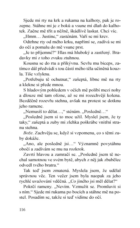 Myslí si, že si naši společnou noc nepamatuju – každičkou vteřinu mám však vypálenou do mozku. Pořád vzpomínám, jak jsem ji držel v náruči a jak se jí z dokonalých rtů draly tiché steny.
