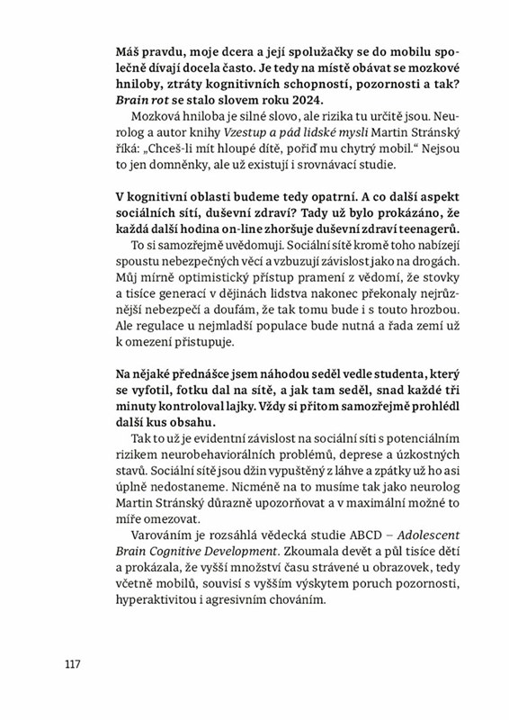 Jak se vyvíjí mozek zdravého dítěte a jak mozek dětí s epilepsií, s ADHD či s poruchami autistického spektra? Proč mají někteří lidé odlišně vyvinutý mozek a predispozice k extrémně násilnému chování? A jaké máme možnosti zasáhnout? Záběr dětského neurologa Vladimíra Komárka dalece přesahuje klinickou praxi – věnuje se otázkám etiky, učení, výchovy i povahy vědomí a svobodné vůle. Knižní rozhovor, zasazený do pestrého životního příběhu lékaře, sleduje zázraky moderní medicíny včetně nejnovějších úspěchů genové terapie.