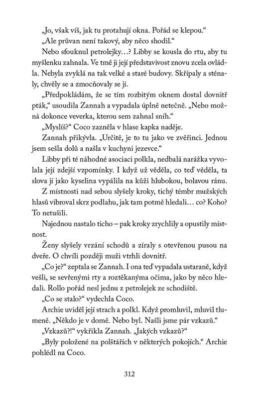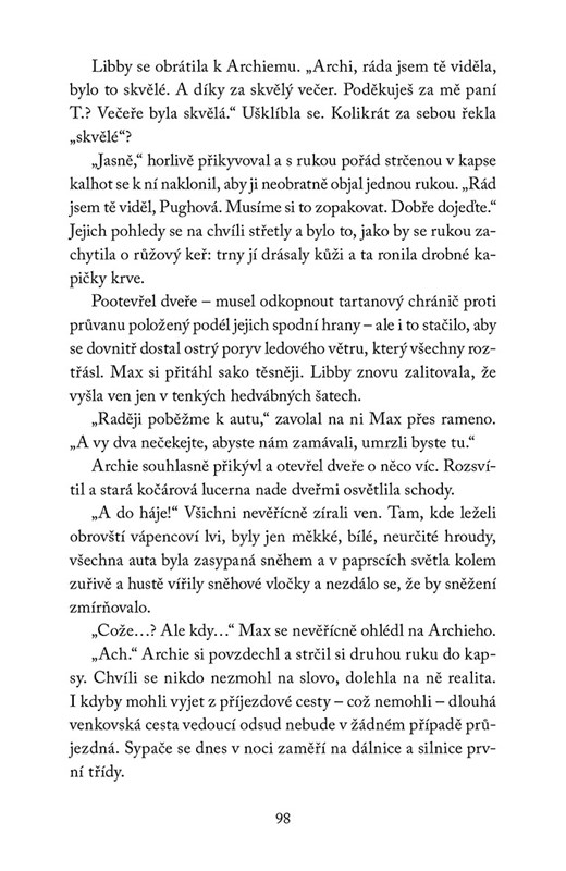 Autorce se skvěle podařilo vykreslit tu tísnivou atmosféru – sníh, tma, výpadek proudu, svíčky a staré emoce, které se derou na povrch. A když se k tomu později přidá lehká krimi linka jde čtení jako po másle. Bohužel mi ale nesedlo, jak moc autorka všechno popisovala. Opravdu mě nezajímalo, co všechno se nachází, v jaké místnosti, co je na talířích apod. Někdo to má rád a pomáhá mu to více si všechno představit, já jsem ale tyhle pasáže přeskakovala.