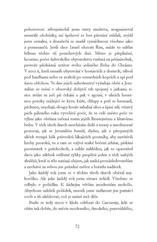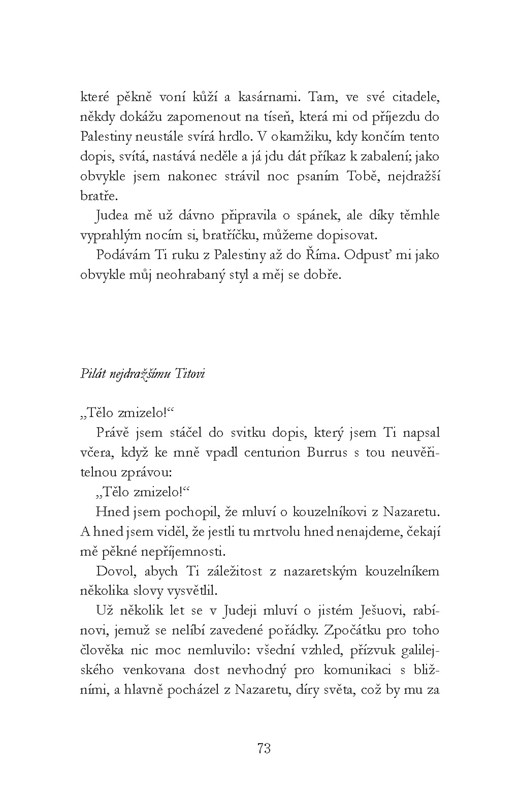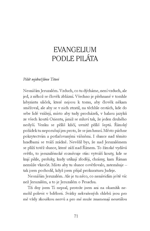 Po tomto úvodu obrací Schmitt perspektivu a další vývoj událostí popisuje pohledem Piláta, vládce zodpovědného Římu za klidnou správu židovské provincie. V dopisech bratrovi Titovi si stěžuje na živobytí v nepochopitelné zemi ovládané cizím náboženstvím. Píše, že došlo k zatčení jakéhosi kouzelníka Ješuy. Jakožto vzdělaný, mírumilovný muž k němu Pilát necítil žádné výrazné antipatie a chtěl ho uchránit od tvrdého postihu. Nakonec musel ustoupit židovským kněžím, kteří si vyžádali ukřižování. Klidného spaní ho ale zbavila událost zcela nečekaná: tělo mrtvého zmizelo a šíří se nebezpečné báchorky o vzkříšení. Co se zdá jako detektivní příběh, nutně nabývá podoby duchovní pouti slavného prefekta, který si chtěl umýt ruce...
