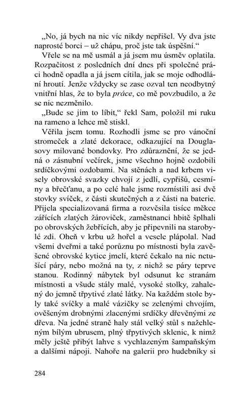 Aristokratický majitel sídla, pohledný vdovec Alexander, zahajuje výrobu řemeslného ginu a Fallon mu pomáhá s jeho uvedením na místním vánočním jarmarku. Společná práce, vůně jehličí a vánočního koření a hlavně Alexandrovy obdivné pohledy způsobí, že si Fallon uvědomí, jak chaotický a přitom osamělý byl její život v Londýně. Chce se k němu vrátit nebo otevře svoje srdce novým možnostem? S rozhodováním jí pomůže nejen jmelí nad dveřmi, ale Alexandrův syn Theo, výstřední teta Constance, zachráněný osel Heathcliff a rozkošný pejsek Runcible.