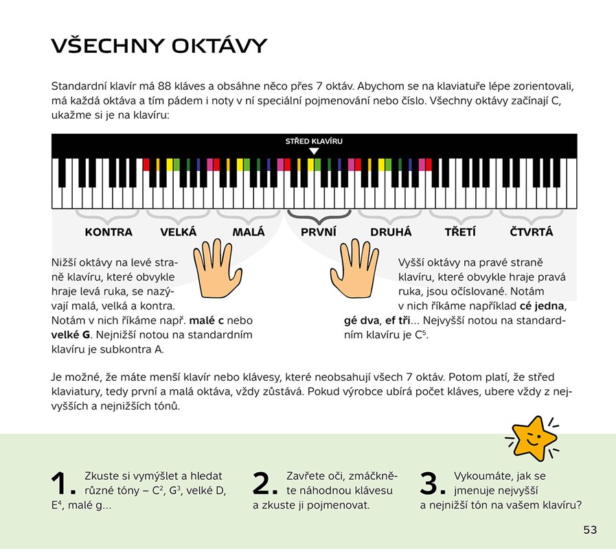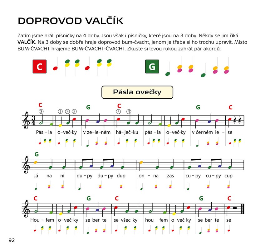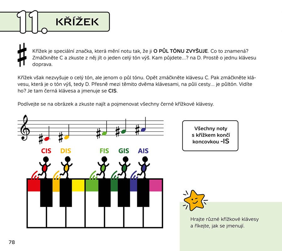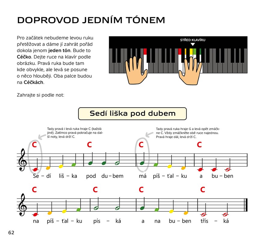 Barevné klávesy zpřístupní hru na klavír nebo klávesy každému, kdo ji vezme do ruky. Bez zbytečných překážek připraví na skutečné, živé hraní, pro lidi i jen tak pro radost. Neobsahuje ani o čárku teorie víc, než potřebujete.