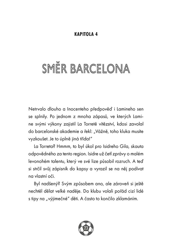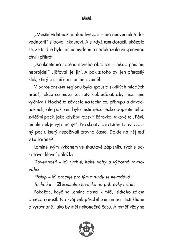 Lamine Yamal, křídelní útočník FC Barcelona, je už ve věku pouhých 18 let opravdovou superhvězdou světového fotbalu a inspirací pro mladé fotbalisty. Rychlý jako blesk a skvělý technik s úžasnou střelou, to je charakteristika tohoto nejlepšího mladého hráče. Díky této knize se seznámíte s jeho životním i fotbalovým příběhem, od začátků v legendární mládežnické akademii La Masia až po vítězství na turnaji EURO 2024. Lamine má před sebou ještě mnoho velkých momentů a úspěchů, ale už teď můžeme říct, že se svým uměním a nadšením pro hru navždy zapsal do srdcí všech fotbalových fanoušků.